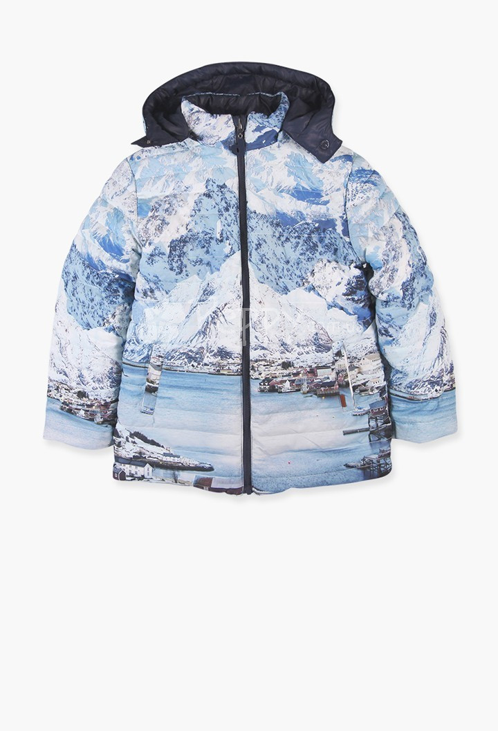 Двухсторонняя зимняя куртка для мальчика из новой коллекции осень-зима 2017-18. Куртка с одной стороны полосатая, с другой стороны по целой площади куртки размещен рисунок, капюшон отстегивается, стянута внизу и на рукавах резинкой. Декоративная отделка - нашивки, врезные кармашки. Цвет: белый, синий, темно синий. Состав: верх- 100% полиамид, подкладка - 100% полиамид. Утеплитель полиэфир (симпатекс). Плотность 250 пл. Производство Испания.