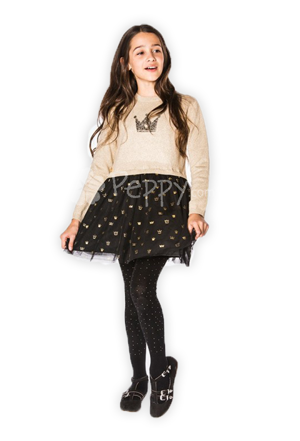 Нарядное теплое платье для девочки из новой коллекции Boboli осень 2018. Верх свитер, низ - фатиновая юбка. Декоративная отделка – аппликация, фатин, принт, люриксная нить. Цвет: золотой, черный. Состав: 49% полиэстер, 44% хлопок, 4% метал. нить, 3% мохер. Производство Испании.