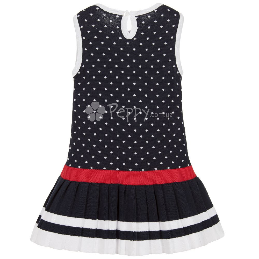 Стильный трикотажный сарафан для девочки из новой коллекции Dr.Kid весна лето. Декоративная отделка – бантик, плиссе, окантовка. Цвет: синий, красный, белый. Расцветка: горошек. Состав: 100% хлопок. Произведено в Португалии.
