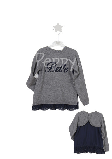 НОВИНКА! Стильный, теплый, нарядный свитер для девочки из новой осенней коллекции Dr.Kid. Декоративная отделка –аппликация, кружево, имитация нижней блузки. Цвет: кофта - серый, блузка - синий. Состав: 15% шерсть, 85% хлопок. Произведено в Португалии.