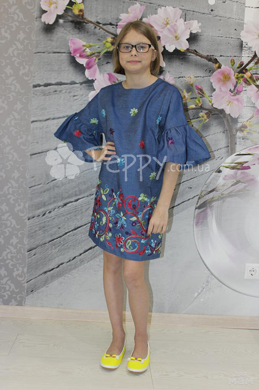 Стильное джинсовое платье для девочки из новой коллекции Mone весна-лето. Удобное, красивое. Декоративная отделка - вышивка купон, рукав-клеш. Цвет: синий. Состав: 100% хлопок. Производство Украина.
