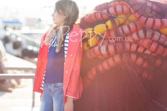 Стильная весенняя парка дождевик для девочки из новой коллекции Tiffosi весна-лето. Ткань водоотталкивающая, не продуваемая, воздухопроводящая. Капюшон отстегивается, застежка на замке и кнопках. Плащ слегка расширен к низу. Декоративная отделка - карманы, на спинке - встречная складка. Цвет: красный, подкладка - сине-белая полоска. Состав: верх- 100% полиамид; подкладка 65% полиэстер, 35% хлопок. Производство Португалия.