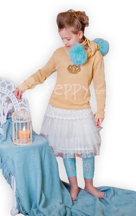 НОВИНКА! Святковий светр для дівчинки з нової колекції Mone осінь-зима 2015. Декоративне оздоблення - мереживо, стрази, перлини. Колір: світло-гірчичний з люрексом. Склад: 50% вовна, 50% акрил.