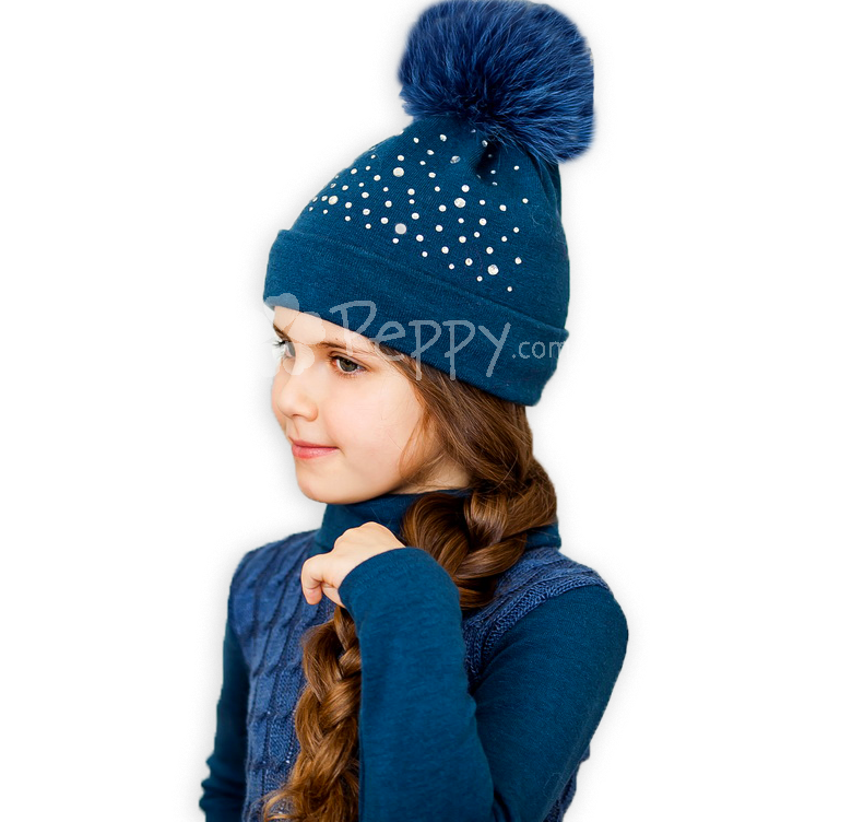 НОВИНКА! Шапка тепла для дівчинки з хутряним пом-понем. Декоративне оздоблення - стрази, пом-пон. Колір: синій. Склад: верх 50% акрил 50% вовна, підкладка 100% поліамід, хутро натуральне - песець. Виготовленно в Україні.