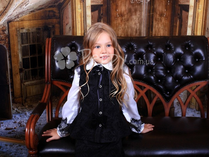 НОВИНКА! Стильний жакет без рукавів для дівчинки з нової коллекції осінь Mone 2017. Зручний та комфортний. Поєднується і з брючками, і з спідничками. Декоративне оздоблення -оксамитовий орнамент на тканині, бантик . Колір: чорний. 50% віскоза, 40% поліамід, 10%лайкра, підкладка -100% поліамід.