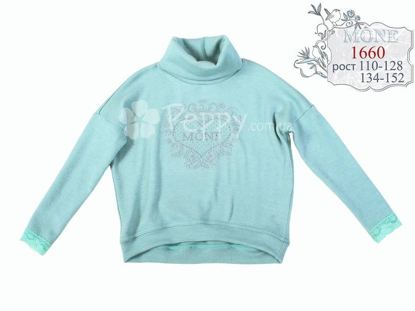 НОВИНКА! Модний светр для дівчинки з нової колекції Mone осінь-зима 2017. Декоративне оздоблення - мереживо, стрази. Колір: блакитний з бірюзовим відтінком. Склад: 50% вовна, 40% віскоза, 10% лакра. Виробництво Україна.